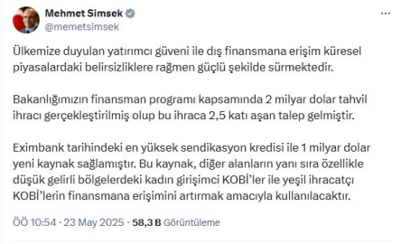 ANKARA, (DHA)- HAZİNE ve Maliye Bakanı Mehmet Şimşek, Eximbank tarihindeki en yüksek sendikasyon kredisi ile 1 milyar dolar yeni kaynak sağlandığını, bu kaynağın kadın girişimci ve yeşil ihracatçı KOBİ'ler için kullanılacağını açıkladı.Hazine ve Maliye Bakanı Mehmet Şimşek, sosyal medya hesabından yaptığı açıklamada, "Ülkemize duyulan yatırımcı güveni ile dış finansmana erişim küresel piyasalardaki belirsizliklere rağmen güçlü şekilde sürmektedir. Bakanlığımızın finansman programı kapsamında 2 milyar dolar tahvil ihracı gerçekleştirilmiş olup bu ihraca 2,5 katı aşan talep gelmiştir. Eximbank tarihindeki en yüksek sendikasyon kredisi ile 1 milyar dolar yeni kaynak sağlamıştır. Bu kaynak, diğer alanların yanı sıra özellikle düşük gelirli bölgelerdeki kadın girişimci KOBİ'ler ile yeşil ihracatçı KOBİ'lerin finansmana erişimini artırmak amacıyla kullanılacaktır" dedi. (DHA)
