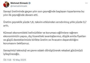 ANKARA, (DHA)- HAZİNE ve Maliye Bakanı Mehmet Şimşek, sanayi üretiminde geçen yılın son çeyreğinde başlayan toparlanmanın, bu yılın ilk çeyreğinde devam ettiğini açıkladı. Hazine ve Maliye Bakanı Mehmet Şimşek, sanayi üretim endeksi verilerine ilişkin sosyal medya hesabından açıklama yaptı. Bakan Şimşek, "Sanayi üretiminde geçen yılın son çeyreğinde başlayan toparlanma bu yılın ilk çeyreğinde devam etti. Üretim çeyreklik yüzde 1,8, takvim etkisinden arındırılmış yıllık yüzde 0,7 arttı. Küresel ekonomideki belirsizlikler ve korumacı eğilimlere rağmen ekonomimizin yapısı, dış ticaretteki avantajlarımız, düşük emtia fiyatları ve güçlü desteklerimizle birlikte üretim ve ihracatın dayanıklılığını korumasını bekliyoruz. Sanayimizi teknoloji ve çevre odaklı dönüştürerek rekabet gücümüzü iyileştireceğiz" dedi. (DHA)