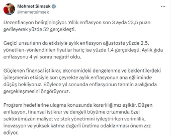 Aliekber METE/ANKARA, (DHA)- HAZİNE ve Maliye Bakanı Mehmet Şimşek, "Güçlenen finansal istikrar, ekonomideki dengelenme ve beklentilerdeki iyileşmenin etkisiyle son çeyrekte aylık enflasyonun ana eğiliminde düşüş bekliyoruz. Böylece yılsonunda enflasyonun tahmin aralığında gerçekleşmesini öngörüyoruz" dedi.Bakan Mehmet Şimşek, sosyal medya hesabından Türkiye İstatistik Kurumu tarafından açıklanan enflasyon verilerine ilişkin açıklama yaptı. Bakan Şimşek, "Dezenflasyon belirginleşiyor. Yıllık enflasyon son 3 ayda 23,5 puan gerileyerek yüzde 52 gerçekleşti. Geçici unsurların da etkisiyle aylık enflasyon ağustosta yüzde 2,5, yönetilen-yönlendirilen fiyatlar hariç ise yüzde 1,4 gerçekleşti. Aylık gıda enflasyonu 4 yıl sonra negatif oldu. Güçlenen finansal istikrar, ekonomideki dengelenme ve beklentilerdeki iyileşmenin etkisiyle son çeyrekte aylık enflasyonun ana eğiliminde düşüş bekliyoruz. Böylece yıl sonunda enflasyonun tahmin aralığında gerçekleşmesini öngörüyoruz. Program hedeflerine ulaşma konusunda kararlılığımız aşikar. Düşen enflasyon, finansal istikrar ve dengeli büyüme ortamında özel sektörümüzün maliyet ve stok yönetimini iyileştirirken verimlilik, inovasyon ve yüksek katma değerli üretime odaklanması önem arz ediyor" ifadelerini kullandı. (DHA)