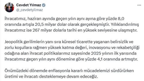 ANKARA, (DHA)- CUMHURBAŞKANI Yardımcısı Cevdet Yılmaz, haziran ayında yıllıklandırılmış ihracatın 267 milyar dolarla tarihi en yüksek seviyesine ulaştığını açıkladı. Cumhurbaşkanı Yardımcısı Cevdet Yılmaz, sosyal medya hesabından yaptığı açıklamada, "İhracatımız, haziran ayında geçen yılın aynı ayına göre yüzde 8 oranında artışla 20,5 milyar dolar olarak gerçekleşmiştir. Yıllıklandırılmış ihracatımız ise 267 milyar dolarla tarihi en yüksek seviyesine ulaşmıştır. Jeopolitik gerilimlerin yanı sıra küresel ticarette yaşanan belirsizlik ve zorlu koşullara rağmen yüksek katma değeri, inovasyonu ve rekabetçiliği odağına alan ihracat politikalarımız sayesinde 2025 yılının ilk yarısında ihracatımız geçen yılın aynı dönemine göre yüzde 4,1 oranında artmıştır. Önümüzdeki dönemde enflasyonla kararlı mücadelemizi sürdürürken üretimi ve ihracatı desteklemeye devam edeceğiz" ifadelerini kullandı. (DHA)