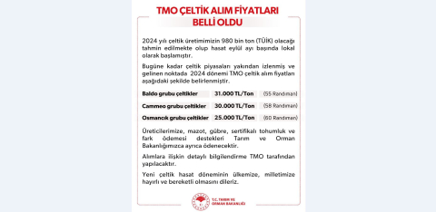 ANKARA, (DHA)- TARIM ve Orman Bakanlığı, Toprak Mahsulleri Ofisi'nin (TMO) 2024 dönemi çeltik alım fiyatlarının belirlediğini açıkladı. Bakanlıktan yapılan açıklamada, 2024 yılı çeltik üretiminin 980 bin ton tahmin edildiği, eylül ayı başında lokal olarak hasadın başladığı belirtildi. Bugüne kadar çeltik piyasalarının yakından izlendiği ve gelinen noktada 2024 dönemi TMO çeltik alım fiyatlarının belirlendiği bildirilerek, "Buna göre; 55 randıman baldo grubu çeltikler ton başına 31 bin TL, 58 randıman Cammeo grubu çeltikler ton başına 30 bin TL, 60 randıman Osmancık grubu çeltikler ton başına 25 bin TL oldu” denildi. Üreticilere mazot, gübre, sertifikalı tohumluk ve fark ödemesi desteklerinin Tarım ve Orman Bakanlığınca ayrıca ödeneceği bildirildi. (DHA)