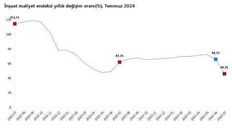 ANKARA, (DHA)- TÜRKİYE İstatistik Kurumu (TÜİK), temmuz ayında inşaat maliyetinin yıllık yüzde 46,35, aylık 1,91 arttığını açıkladı.TÜİK, Temmuz 2024 dönemine ilişkin inşaat maliyet endeksi verilerini açıkladı. Buna göre; inşaat maliyeti bir önceki aya göre yüzde 1,91, bir önceki yılın aynı ayına göre yüzde 46,35 arttı. Bir önceki aya göre malzeme endeksi yüzde 2,12, işçilik endeksi yüzde 1,49 arttı. Bir önceki yılın aynı ayına göre malzeme endeksi yüzde 41,01, işçilik endeksi yüzde 58,40 arttı.Bina inşaatı maliyeti, bir önceki aya göre yüzde 1,53, bir önceki yılın aynı ayına göre yüzde 46,78 arttı. Bina dışı yapılar için inşaat maliyeti, bir önceki aya göre yüzde 3,14, bir önceki yılın aynı ayına göre yüzde 45,01 arttı. (DHA)