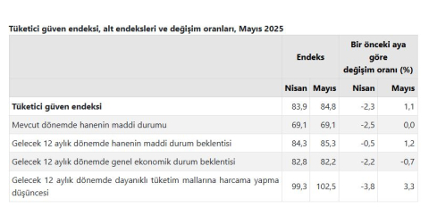 ANKARA, (DHA)- TÜRKİYE İstatistik Kurumu (TÜİK), tüketici güven endeksinin mayısta aylık 1,1 artarak 84,8 olduğunu açıkladı. TÜİK, Mayıs 2025 dönemine ilişkin tüketici güven endeksi verilerini açıkladı. Buna göre; tüketici güven endeksi, bir önceki aya göre yüzde 1,1 oranında artarak 84,8 oldu. Alt endekslerdeki değişim oranlarına bakıldığında; bir önceki aya göre mevcut dönemde hanenin maddi durumu endeksi değişim göstermeyerek 69,1 seviyesinde gerçekleşti. Gelecek 12 aylık dönemde hanenin maddi durum beklentisi endeksi yüzde 1,2 artarak 85,3, gelecek 12 aylık dönemde genel ekonomik durum beklentisi endeksi yüzde 0,7 azalarak 82,2, gelecek 12 aylık dönemde dayanıklı tüketim mallarına harcama yapma düşüncesi endeksi yüzde 3,3 artarak 102,5 oldu. (DHA)