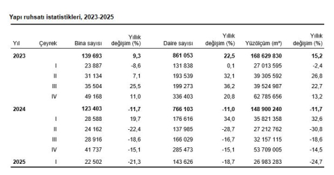 ANKARA, (DHA)- TÜRKİYE İstatistik Kurumu (TÜİK), belediyeler tarafından yapı ruhsatı verilen bina sayısının, ocak-mart döneminde geçen yılın aynı dönemine göre yüzde 21,3 azaldığını açıkladı. TÜİK, 2025 yılı 1'inci çeyreğine ilişkin yapı izin istatistiklerini açıkladı. Bir önceki yılın aynı çeyreğine göre, belediyeler tarafından yapı ruhsatı verilen bina sayısı yüzde 21,3, daire sayısı yüzde 18,7 ve yüz ölçümü yüzde 24,7 azaldı. Yapı ruhsatı verilen yapıların toplam yüz ölçümü 27 milyon metrekare olurken, bunun 14,8 milyon metrekaresi konut, 6,6 milyon metrekaresi konut dışı ve 5,7 milyon metrekaresi ortak kullanım alanı olarak gerçekleşti. Kullanma amacına göre en yüksek pay 18,9 milyon metrekareyle iki ve daha fazla daireli ikamet amaçlı binaların oldu. Bunu 2,1 milyon metrekareyle sanayi binaları ve depolar izledi.YAPI KULLANMA İZİNİ VERİLEN BİNA SAYISI AZALDIBelediyeler tarafından yapı kullanma izini verilen bina sayısı, bir önceki yılın aynı çeyreğine göre yüzde 28, daire sayısı yüzde 25,8 ve yüz ölçümü yüzde 31 azaldı. Bu yapıların toplam yüz ölçümü 25,2 milyon metrekare olurken, bunun 14,1 milyon metrekaresini konut, 5,9 milyon metrekaresini konut dışı ve 5,1 milyon metrekaresini ortak kullanım alanları oluşturdu. Kullanma amacına göre en yüksek pay 18,1 milyon metrekareyle iki ve daha fazla daireli ikamet amaçlı binaların oldu. Bunu 1,9 milyon metrekareyle sanayi binaları ve depolar takip etti. (DHA)