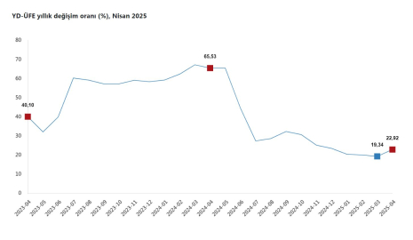 ANKARA, (DHA)- TÜRKİYE İstatistik Kurumu (TÜİK), nisan ayında yurt dışı üretici fiyatlarının yıllık yüzde 22,92, aylık yüzde 4,41 arttığını açıkladı.TÜİK, Nisan 2025 dönemine ilişkin yurt dışı üretici fiyat endeksi verilerini açıkladı. Buna göre; yurt dışı üretici fiyatları bir önceki aya göre yüzde 4,41, bir önceki yılın aralık ayına göre yüzde 13,10, bir önceki yılın aynı ayına göre yüzde 22,92 ve 12 aylık ortalamalara göre yüzde 28,57 arttı.Sanayinin 2 sektörünün yıllık değişimleri; madencilik ve taş ocakçılığında yüzde 19,96 artış, imalatta yüzde 22,97 artış olarak gerçekleşti. Ana sanayi gruplarının yıllık değişimleri; ara mallarında yüzde 21,15 artış, dayanıklı tüketim mallarında yüzde 30,42 artış, dayanıksız tüketim mallarında yüzde 25,64 artış, enerjide yüzde 11,03 azalış, sermaye mallarında yüzde 28,07 artış olarak gerçekleşti.Sanayinin 2 sektörünün aylık değişimleri ise madencilik ve taş ocakçılığında yüzde 2,10 artış, imalatta yüzde 4,45 artış olarak gerçekleşti. Ana sanayi gruplarının aylık değişimleri; ara mallarında yüzde 4 artış, dayanıklı tüketim mallarında yüzde 7,50 artış, dayanıksız tüketim mallarında yüzde 4,93 artış, enerjide yüzde 3,76 azalış, sermaye mallarında yüzde 5,37 artış olarak gerçekleşti. (DHA)