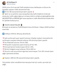 ANKARA, (DHA)- İÇİŞLERİ Bakanı Ali Yerlikaya, 24 Nisan-1 Mayıs 2025 tarihleri arasında 3 milyon 619 bin 38 aracın denetlendiğini belirterek, 496 bin 95 araca/sürücüye işlem yapıldığını duyurdu.Bakan Yerlikaya, sosyal medya hesabından yaptığı açıklamada, "2025 yılının ilk 4 ayında trafik ekiplerimizce; helikopter ve dron ile havadan yapılan trafik denetimlerinde 37 bin 56 araca/sürücüye işlem yapıldı. Şehir içi ve şehirler arası kara yollarında trafik ihlallerini önlemek amacıyla, trafik yoğunluğunun ve kaza riskinin arttığı yol güzergahlarında helikopter ve dron gibi hava taşıtlarını trafik denetimlerimizde etkin bir şekilde kullanıyoruz" dedi.TRAFİK DENETİMLERİPaylaşımında ayrıca, 24 Nisan-1 Mayıs tarihleri arasında yapılan trafik denetimi verilerine yer veren Bakan Yerlikaya, "Emniyet ve jandarma trafik ekiplerimizce 24 Nisan-1 Mayıs 2025 tarihleri arasında 3 milyon 619 bin 38 araç denetlendi. Işıklı ya da sesli uyarı işareti bulunan cihazları (çakar) mevzuatta izin verilmeyen araçlara takarak kullanan 39 sürücüye işlem yapıldı. Hız ihlalinde bulunan 151 bin 392, periyodik muayenesi yaptırılmamış 27 bin 197, emniyet kemeri kullanmayan 25 bin 815, sürücü belgesiz araç kullanan 16 bin 622 ve zorunlu mali sorumluluk sigortası bulunmayan 7 bin 301 olmak üzere diğer işlemlerle birlikte; toplam 496 bin 95 araca/sürücüye işlem yapıldı. Yolculuklar sizleri sevdiklerinize kavuşturmak için vardır, ayırmak için değil" ifadelerini kullandı. (DHA)
