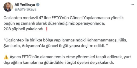 ANKARA, (DHA)- İÇİŞLERİ Bakanı Ali Yerlikaya, Gaziantep merkezli 47 ilde FETÖ'nün güncel yapılanmasına yönelik operasyonlarda 208 şüphelinin yakalandığını açıkladı.İçişleri Bakanı Ali Yerlikaya'nın sosyal medya hesabından yaptığı açıklamaya göre; Gaziantep Cumhuriyet Başsavcılığı ve Emniyet Genel Müdürlüğü koordinesinde, FETÖ'nün güncel yapılanmasına yönelik 47 ilde eş zamanlı operasyonlar düzenlendi. 208 şüphelinin yakalandığı operasyonda, Gaziantep ile birlikte, bölge yapılanmasındaki Kahramanmaraş, Kilis, Şanlıurfa ve Adıyaman'da güncel örgüt yapısı deşifre edildi. Ayrıca; FETÖ'nün eleman temin etme yöntemleri tespit edilerek, yurt dışı eğitim kamplarına götürdükleri örgüt üyeleri yakalandı.Şüphelilerin, kripto haberleşme programları üzerinden yurt içi ve yurt dışı güncel toplantılar yaptıkları, örgüt üyeleri tarafından kurulan şirketler aracılığıyla terör örgütünü ve üyelerini finanse ettikleri tespit edildi. (DHA)