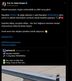 'HER TEST, VİZYONUMUZU İLERİYE TAŞIYOR'Savunma Sanayii Başkanı Haluk Görgün, AKINCI TİHA ve KEMANKEŞ mini akıllı seyir füzesinin atış, seyir ve dalış testine ilişkin, sosyal medya hesabından yaptığı açıklamada, "Yüksek hassasiyet, özgün mühendislik ve etkili vuruş gücü. Bayraktar AKINCI ile göğe yükselen 2 adet Bayraktar KEMANKEŞ; aklın, azmin ve yüksek teknolojinin sembolü olarak hedefini şaşmıyor. Seyirden dalışa, vuruştan etkiye. Her test, bağımsız savunma sanayii vizyonumuzu daha da ileriye taşıyor. Emek veren tüm ekipleri yürekten tebrik ediyorum" ifadelerini kullandı. (DHA)