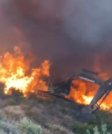 Alican GÜMÜŞ/HATAY, (DHA)- HATAY'da 3 gün süren müdahalenin ardından kontrol altına alınan yangın sırasında ekskavatörü ile alevlerin arasında kalan operatörün, panik halinde hızla bölgeden uzaklaştığı görüntüler ortaya çıktı.Antakya ilçesi Karaali Mahallesi’nde 30 Haziran'da başlayıp, çevresindeki 3 mahalleye daha sıçrayan orman yangını, havadan ve karadan müdahaleyle dün kontrol altına alındı. Söndüre çalışmalarına vatandaşlar da destek verdi. Yangının önünün kesilmesi için vatandaşlar kendilerine ait araçlarıyla müdahaleye katıldı. Bu sırada yol açma çalışmalarına desteğe gelen ekskavatör operatörü Furkan Ulaş, alevlerin arasında kaldı. Rüzgarın yön değiştirmesiyle paniğe kapılan Ulaş, aracıyla hızla uzaklaşarak ölümden döndü. Panik anları, çevredekiler tarafından cep telefonu kamerasıyla görüntülendi. (DHA)