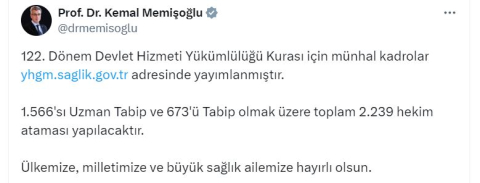 ANKARA, (DHA)- SAĞLIK Bakanı Kemal Memişoğlu, "1566'sı uzman tabip ve 673'ü tabip olmak üzere toplam 2 bin 239 hekim ataması yapılacaktır" dedi.Bakan Memişoğlu, sosyal medya hesabından yaptığı açıklamada, "122'nci Dönem Devlet Hizmeti Yükümlülüğü Kurası için münhal kadrolar 'http://yhgm.saglik.gov.tr' adresinde yayımlanmıştır. 1566'sı uzman tabip ve 673'ü tabip olmak üzere toplam 2 bin 239 hekim ataması yapılacaktır. Ülkemize, milletimize ve büyük sağlık ailemize hayırlı olsun" ifadelerini kullandı. (DHA)