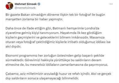 ANKARA, (DHA)- HAZİNE ve Maliye Bakanı Mehmet Şimşek, “Bir gazete bakan olmadığım döneme ilişkin tek bir fotoğraf ile bugün manşetten zorlama bir haber yapmıştır. Daha önce de ifade ettiğim gibi, Batmanlı hemşehrimle Londra'da ziyaretime gelmiş kişiyi tanımıyorum. Hayatımda ilk kez gördüğüm kişilerin geçmişlerini ve geleceklerini bilmem imkansızdır" dedi.Bakan Şimşek, sosyal medya hesabından yaptığı açıklamada, "Bir gazete bakan olmadığım döneme ilişkin tek bir fotoğraf ile bugün manşetten zorlama bir haber yapmıştır. Daha önce de ifade ettiğim gibi, Batmanlı hemşehrimle Londra'da ziyaretime gelmiş kişiyi tanımıyorum. Hayatımda ilk kez gördüğüm kişilerin geçmişlerini ve geleceklerini bilmem imkansızdır. Masamıza oturan veya fotoğraf çektirdiğimiz kişilerle irtibatlı olduğumuz iddiası ise akıl dışıdır. Ekonomi programımız her zorluğun üstesinden gelip başarılı şekilde sürmektedir. Görevimizi hakkıyla yürüttükçe bu saldırıların devam etmesine de, bu mesnetsiz iddiaların zamanlamasına da şaşırmıyoruz. Çabamız, aziz milletimizin arzuladığı huzur ve refah içindir. Akıl ve gerçek dışı saldırıların sonuca ulaşamayacağı bilinmelidir" ifadelerini kullandı. (DHA)