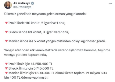 Bakan Yerlikaya: Yangınlardan etkilenen vatandaşlara 21,6 milyon lira ödeme yapıldı