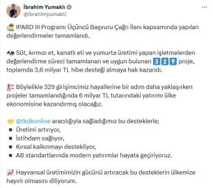 ANKARA, (DHA)- TARIM ve Orman Bakanı İbrahim Yumaklı, IPARD 3 Programı Üçüncü Başvuru Çağrı İlanı kapsamında 329 projeye 3,6 milyar TL hibe desteği sağlanacağını açıkladı. Tarım ve Orman Bakanı İbrahim Yumaklı, sosyal medya hesabından yaptığı açıklamada, "IPARD 3 Programı Üçüncü Başvuru Çağrı İlanı kapsamında yapılan değerlendirmeler tamamlandı. Süt, kırmızı et, kanatlı eti ve yumurta üretimi yapan işletmelerden değerlendirme süreci tamamlanan ve uygun bulunan 329 proje, toplamda 3,6 milyar TL hibe desteği almaya hak kazandı. Böylelikle 329 girişimcimiz hayallerine bir adım daha yaklaşırken projeler tamamlandığında 6 milyar TL tutarındaki yatırımı ülke ekonomisine kazandırmış olacağız" dedi.Hibe desteğinin Tarım ve Kırsal Kalkınmayı Destekleme Kurumu aracılığıyla sağlandığına işaret eden Yumaklı, "Bu desteklerle; üretimi artırıyor, istihdam sağlıyor, kırsal kalkınmayı destekliyor, AB standartlarında modern yatırımlar hayata geçiriyoruz. Hayvansal üretimimizin gücünü artıracak bu desteklerin ülkemize hayırlı olmasını diliyorum" açıklamasında bulundu. (DHA)