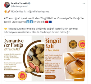 ANKARA, (DHA)- TARIM ve Orman Bakanı İbrahim Yumaklı, Bingöl balı ve Osmaniye yer fıstığının Avrupa Birliği'nden (AB) coğrafi işaret tescili aldığını ve böylece coğrafi işaretli ürün sayısının 23'e yükseldiğini duyurdu.Bakan Yumaklı, sosyal medya hesabından yaptığı açıklamada, "Günümüze iki müjde ile başlıyoruz. AB'den coğrafi işaret tescili alan 'Bingöl balı' ve 'Osmaniye yer fıstığı' ile tescilli ürün sayımız 23'e yükseldi. Paydaş kurumlarımızla iş birliğinde coğrafi işaretli ürün sayımızı artırmaya ve uluslararası alanda tanıtmaya devam edeceğiz" dedi. (DHA)