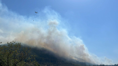 HAVADAN VE KARADAN MÜDAHALEMuğla'nın Bodrum ilçesinin Pınarlıbelen ile Kumköy mahalleleri arasında çıkan orman yangınına 8 uçak, 10 helikopter, 33 arazöz, 10 itfaiye aracı, 1 Ulusal Medikal Kurtarma Ekibi Birimi (UMKE) aracı, 2 ambulans, 1 TOMA, 16 su tankeri ile müdahale ediliyor. (DHA)Fırat AKAY/BODRUM (Muğla), (DHA)