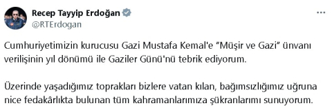 ANKARA, (DHA)- CUMHURBAŞKANI Recep Tayyip Erdoğan, "Cumhuriyetimizin kurucusu Gazi Mustafa Kemal'e "Müşir ve Gazi" ünvanı verilişinin yıl dönümü ile Gaziler Günü'nü tebrik ediyorum" dedi.Cumhurbaşkanı Erdoğan, sosyal medya hesabı üzerinden yaptığı açıklamada, "Cumhuriyetimizin kurucusu Gazi Mustafa Kemal'e "Müşir ve Gazi" ünvanı verilişinin yıl dönümü ile Gaziler Günü'nü tebrik ediyorum. Üzerinde yaşadığımız toprakları bizlere vatan kılan, bağımsızlığımız uğruna nice fedakârlıkta bulunan tüm kahramanlarımıza şükranlarımı sunuyorum" ifadelerini kullandı. (DHA)