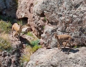 Muzaffer KOŞAN/ERZİNCAN, (DHA)- Erzincan’ın Kemah ilçesinde yavrularını emziren 2 dağ keçisi, doğa fotoğrafçısı Fatih Civan tarafından dronla görüntülendi.Zengin yaban hayatı ve eşsiz doğasıyla dikkat çeken Kemah ilçesinde, nesli koruma altında olan yaban keçileri dronla görüntülendi. Dağlık bölgede yavrularını emziren 2 anne keçi, doğa fotoğrafçısı Fatih Civan tarafından zoom özellikli dronla uzaktan kayıt altına alındı. Görüntüleri sosyal medya hesabından paylaşan Civan, özellikle yavrulama döneminde vahşi hayvanların yaşam alanlarına saygı gösterilmesinin önemine dikkat çekti. Fatih Civan’ın paylaşımı kısa sürede büyük beğeni topladı. (DHA)