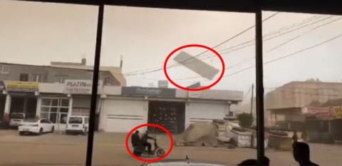 Salih KESKİN/KIZILTEPE (Mardin), (DHA)- MARDİN’in Kızıltepe ilçesinde etkili olan fırtınada bir iş yerinin çatısından uçan sac levha, elektrik tellerine çarpıp yön değiştirdi. Bu sırada yoldan geçen motosikletteki 2 kişi ölümden döndü.Meteoroloji 15'inci Bölge Müdürlüğü'nün uyarılarının ardından dün akşam saatlerinde Mardin'de de fırtına etkili oldu. Kızıltepe ilçesindeki fırtınada bazı ev ve iş yerlerinin çatıları uçtu, elektrik direkleri ve ağaçlar devrildi. Dün akşam saatlerinde Sanayi Mahallesi’nde bir iş yerinin damında bulunan çatı malzemeleri de kuvvetli rüzgarla birlikte sokağa savruldu. Bir sac levha, sokaktan geçen ve üzerinde 2 kişi bulunan motosiklete doğru yöneldi. Elektrik tellerine çarpan levha yön değiştirirken, olayı cep telefonu ile görüntüleyen kişi o an panik yaşayarak motosikletlilere seslendi. O anlar saniye saniye kaydedilirken, olayda yaralanan olmadı. (DHA)