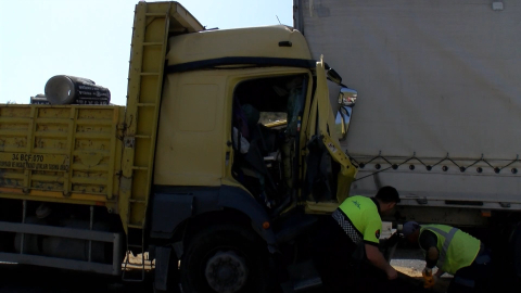 İsa ALMAÇAYIR/İSTANBUL,(DHA)-KUZEY Marmara Otoyolu’nda kamyonun TIR'a arkadan çarpması sonucu meydana gelen trafik kazasında kamyon şoförü ağır yaralandı.Kaza, saat 15.20 sıralarında Kuzey Marmara Otoyolu Paşaköy mevkiinde meydana geldi. Edinilen bilgiye göre; A.Ç'nin idaresindeki 34 BCF 070 plakalı hafriyat kamyonu, aynı istikamette ilerleyen Yakup Erat'ın kullandığı 34 SH 0064 plakalı TIR'a arkadan çarptı. Kazayı gören diğer sürücülerin ihbarı üzerine olay yerine itfaiye, jandarma ve sağlık ekibi sevk edildi. İtfaiye ekipleri, kamyon şoför A.Ç.'yi sıkıştığı yerden çıkararak sağlık ekiplerine sevk etti. Sağlık ekiplerinin ilk müdahalesini olay yerinde yaptığı şoför A.Ç., ağır yaralı olarak hastaneye kaldırıldı. Jandarma ekipleri, kaza nedeniyle iki şeridi kapalı olan otoyolda trafik güvenliğini sağladı. Araçların kaldırılmasının ardından kumlanarak temizlenen yol trafiğe açıldı. Jandarma ekipleri kazayla ilgili çalışma başlattı. (DHA)