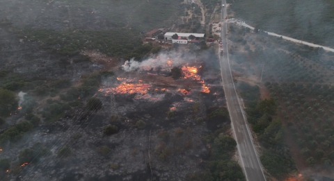 YANGIN DRON İLE GÖRÜNTÜLENDİİzmir'in Çeşme ilçesinde tarım arazisinde çıktıktan sonra ormana sıçrayan yangın, rüzgarın da şiddetiyle geniş bir alana yayıldı. Gece boyunca devam eden yangının neden olduğu zarar, gün aydınlanınca ortaya çıktı. Yangın bölgesi dron ile görüntülendi. Öte yandan, havanın aydınlanmasıyla birlikte havadan müdahale yeniden başladı. Halil İbrahim KARABIYIK/İZMİR, (DHA)