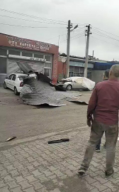 Volkan KARABAĞ/KARS, (DHA)- KARS'ta etkili olan kuvvetli rüzgar sebebiyle 2 iş yerinin çatısı uçtu.Kentte bugün öğle saatlerinde başlayan sağanak, yerini kuvvetli rüzgara bıraktı. Hızı giderek artan rüzgar sebebiyle Kars Küçük Sanayi Sitesi'nde 2 iş yerinin çatısı uçtu. Cadde ve sokaklara savrulan çatı parçaları nedeniyle esnaf, araçların çekilmesi için uyarıda bulundu. Vatandaşlar, yola saçılan çatı parçalarını topladı. (DHA)
