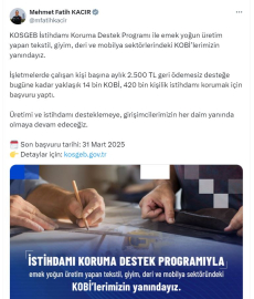 ANKARA, (DHA)- SANAYİ ve Teknoloji Bakanı Mehmet Fatih Kacır, Küçük ve Orta Ölçekli İşletmeleri Geliştirme ve Destekleme İdaresi Başkanlığı'nın (KOSGEB) başlattığı İstihdamı Koruma Destek Programı'na bugüne kadar yaklaşık 14 bin küçük ve orta ölçekli işletmenin (KOBİ) 420 bin kişilik istihdamı korumak için başvuru yaptığını açıkladı.Bakan Kacır, sosyal medya hesabından yaptığı açıklamada, "KOSGEB İstihdamı Koruma Destek Programı ile emek yoğun üretim yapan tekstil, giyim, deri ve mobilya sektörlerindeki KOBİ'lerimizin yanındayız. İşletmelerde çalışan kişi başına aylık 2 bin 500 TL geri ödemesiz desteğe bugüne kadar yaklaşık 14 bin KOBİ, 420 bin kişilik istihdamı korumak için başvuru yaptı. Üretimi ve istihdamı desteklemeye, girişimcilerimizin her daim yanında olmaya devam edeceğiz" dedi.Bakan Kacır ayrıca, son başvuru tarihinin 31 Mart 2025 olduğunu kaydederek, konuyla ilgili detaylara 'http://kosgeb.gov.tr' internet adresinden ulaşılabileceğini belirtti. ÜST LİMİT 7 MİLYON 470 BİN TLÖte yandan Sanayi ve Teknoloji Bakanlığı'ndan yapılan açıklamaya göre, geçen ay başvuruların alınmaya başladığı İstihdamı Koruma Destek Programı'ndan; tekstil, giyim, deri ve mobilya imalatı sektörlerinde faaliyet gösteren işletmeler faydalanabilecek. Program ile emek yoğun imalat sanayi sektörlerinde faaliyet gösteren işletmelere 2024 yılının son üç ayına ait aylık ortalama çalışan SGK prim gün sayısını 2025 yılında koruması durumunda, çalışan başına aylık 2 bin 500 TL geri ödemesiz olarak performans desteği sağlanacak. Programa başvuran 249 çalışanı olan bir işletme için desteğin üst limiti 7 milyon 470 bin TL olacak. Bu programla, KOBİ'lerin istihdamını koruması, sektördeki iş sürekliliğinin desteklenmesi amaçlanıyor. Destek, işletmelerin mali yüklerini hafifletirken, çalışanların işlerini korumalarına yardımcı oluyor. (DHA)