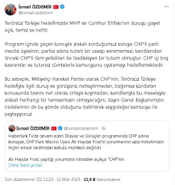 ANKARA,(DHA)- MİLLİYETÇİ Hareket Partisi (MHP) Genel Başkan Yardımcısı İsmail Özdemir, 'Terörsüz Türkiye' hedefiyle ilgili Cumhuriyet Halk Partisi (CHP) ile görüşmeme kararı aldıklarını açıkladı.MHP Genel Başkan Yardımcısı İsmail Özdemir, CHP Meclis Üyesi Ali Haydar Fırat'ın 'Terörsüz Türkiye' sürecine yönelik bir televizyon programında yaptığı değerlendirmelere sosyal medya hesabından yaptığı paylaşım ile açıklamalarda bulundu. Özdemir, paylaşımında, "Terörsüz Türkiye hedefimizde MHP ve Cumhur İttifakı’nın duruşu gayet açık, temiz ve nettir. Program içinde geçen konuyla alakalı sorduğumuz soruya CHP’li parti meclisi üyesinin, partisi adına tutarlı bir cevap verememesi, kendisinden önceki CHP’li tüm yetkilileri de tasdikleyen bir tutum olmuştur. CHP içi boş kavramlar ve tutarsız cümlelerle kamuoyunu oyalamayı hedeflemektedir. Bu sebeple, Milliyetçi Hareket Partisi olarak CHP’nin, Terörsüz Türkiye hedefiyle ilgili duruş ve görüşünü netleştirmeden, bağımsız Kürdistan konusunda tavrını net olarak ortaya koymadan, kendileriyle bu meseleyle alakalı herhangi bir temasımızın olmayacağını, Sayın Genel Başkanımızın iradelerinin de bu yönde olduğunu belirterek, saygıdeğer kamuoyu ile paylaşıyoruz" ifadelerini kullandı. (DHA)