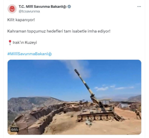 ANKARA, (DHA)- MİLLİ Savunma Bakanlığı (MSB), Pençe-Kilit Harekatı bölgesinden 'Kilit kapanıyor' notuyla görüntü paylaştı.MSB'nin sosyal medya hesabında, Irak'ın kuzeyinde yürütülen Pençe-Kilit Harekatı'na ilişkin görüntü paylaşıldı. 'Kilit kapanıyor, kahraman topçumuz hedefleri tam isabetle imha ediyor' notuyla paylaşılan görüntülerde, terör hedeflerine yönelik yapılan atışlar yer aldı. Bakanlık, son 4 günde 'Kilit kapanıyor' notuyla 4'üncü kez paylaşım yaptı. (DHA)