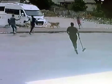 Ceyhun ÖZER/CEYHAN (Adana), (DHA)- ADANA'da 2 sokak köpeğinin peşinden koştuğu çocuğu çevredeki esnaf kurtardı. O anlar güvenlik kamerasına yansıdı.Olay, 1 Mayıs saat 17.00 sıralarında Ceyhan ilçesi Ulus Mahallesi'nde meydana geldi. Sokakta oynayan bir çocuk, köpeklerin üzerine koşması üzerine yolun karşısına geçerek kaçtı. Korkup, kaçan çocuğu fark eden esnaf, tahta sopalarla yardımına koştu. Çocuğun üzerine koşmaya devam eden köpekler, esnafın müdahalesiyle uzaklaştırıldı. Çocuğun, köpeklerin saldırısından son anda kurtulduğu anlar bir iş yerinin güvenlik kamerasına yansıdı. (DHA)