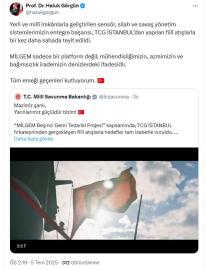'MİLGEM, İRADEMİZİN DENİZLERDEKİ İFADESİDİR'Savunma Sanayii Başkanı Haluk Görgün, TCG İSTANBUL fırkateyninden gerçekleştirilen atışlara ilişkin sosyal medya hesabından açıklama yaptı. Görgün, "Yerli ve milli imkanlarla geliştirilen sensör, silah ve savaş yönetim sistemlerimizin entegre başarısı, TCG İSTANBUL'dan yapılan fiili atışlarla bir kez daha sahada teyit edildi. MİLGEM sadece bir platform değil; mühendisliğimizin, azmimizin ve bağımsızlık irademizin denizlerdeki ifadesidir. Tüm emeği geçenleri kutluyorum" dedi. (DHA)