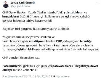 ANKARA, (DHA)- AK Parti Genel Sekreteri Eyüp Kadir İnan, "CHP gençleri önemsiyor ise para kulelerini gizlemek için gençleri paravan olarak illegaliteye davet etmeye bir son vermelidir" dedi. AK Parti'li Eyüp Kadir İnan, sosyal medya hesabından yaptığı açıklamada, "CHP Genel Başkanı Özgür Özel'in İstanbul'daki yolsuzlukların ve hırsızlıkların üstünü örtmek için kullanmaya ve kışkırtmaya çalıştığı gençler hakkında tahliye kararı verildi. Bağımsız Türk yargımız bu kararın yegane sahibidir. Yargımıza sürekli seviyesizce saldıran ve tarihi boyunca gençlere düşman kesilen CHP, ortaya çıkan hırsızlığı kapatmak uğruna gençlerin hayatlarını karartmayı göze almış olsa da kurmaya çalıştıkları kirli oyun elbette gençlerimizin üzerinde tutmayacak. CHP gençleri önemsiyor ise para kulelerini gizlemek için gençleri paravan olarak illegaliteye davet etmeye bir son vermelidir" ifadelerini kullandı. (DHA)