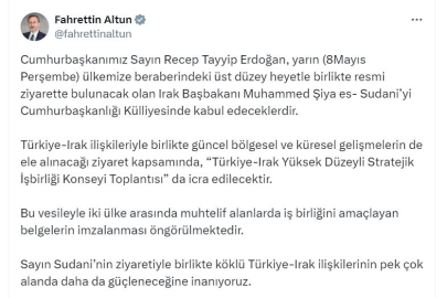 ANKARA, (DHA)-CUMHURBAŞKANI Recep Tayyip Erdoğan, yarın Türkiye'ye resmi ziyarette bulunacak olan Irak Başbakanı Muhammed Şiya es- Sudani'yi kabul edecek.İletişim Başkanı Fahrettin Altun, ziyarete ilişkin sosyal medya hesabından açıklama yaptı. Altun, "Cumhurbaşkanımız Sayın Recep Tayyip Erdoğan, yarın ülkemize beraberindeki üst düzey heyetle birlikte resmi ziyarette bulunacak olan Irak Başbakanı Muhammed Şiya es- Sudani'yi Cumhurbaşkanlığı Külliyesinde kabul edeceklerdir. Türkiye-Irak ilişkileriyle birlikte güncel bölgesel ve küresel gelişmelerin de ele alınacağı ziyaret kapsamında, 'Türkiye-Irak Yüksek Düzeyli Stratejik İşbirliği Konseyi Toplantısı' da icra edilecektir. Bu vesileyle iki ülke arasında muhtelif alanlarda iş birliğini amaçlayan belgelerin imzalanması öngörülmektedir. Sayın Sudani'nin ziyaretiyle birlikte köklü Türkiye-Irak ilişkilerinin pek çok alanda daha da güçleneceğine inanıyoruz" dedi. (DHA)