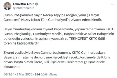 ANKARA, (DHA)- CUMHURBAŞKANI Recep Tayyip Erdoğan, yarın Kuzey Kıbrıs Türk Cumhuriyeti'ni (KKTC) ziyaret edecek.İletişim Başkanı Fahrettin Altun, sosyal medya hesabından yaptığı açıklamada, "Cumhurbaşkanımız Sayın Recep Tayyip Erdoğan, yarın Kuzey Kıbrıs Türk Cumhuriyeti'ni ziyaret edeceklerdir. Sayın Cumhurbaşkanımız ziyaret kapsamında, yapımı tamamlanan KKTC Cumhurbaşkanlığı, Cumhuriyet Meclisi, Başbakanlık ve Millet Bahçesi'nin bulunduğu yerleşkenin açılışını yapacak ve TEKNOFEST KKTC ödül törenine katılacaklardır. Ziyaret vesilesiyle Sayın Cumhurbaşkanımız, KKTC Cumhurbaşkanı Sayın Ersin Tatar ile de görüşme gerçekleştirecek; görüşmelerde Kıbrıs davası başta olmak üzere, ikili ilişkiler ve uluslararası gelişmeler ele alınacaktır" ifadelerini kullandı. (DHA)