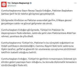 ANKARA, (DHA)- CUMHURBAŞKANI Recep Tayyip Erdoğan, Pakistan Başbakanı Şahbaz Şerif ile telefon görüşmesi gerçekleştirdi. Görüşmede, 6 Mayıs gecesi gerçekleşen saldırı ve güncel gelişmeler ele alındı. İletişim Başkanlığı’ndan yapılan açıklamaya göre, Cumhurbaşkanı Recep Tayyip Erdoğan, Pakistan Başbakanı Şahbaz Şerif ile bir telefon görüşmesi gerçekleştirdi. Görüşmede Hindistan ve Pakistan arasındaki gerilim, 6 Mayıs gecesi gerçekleşen saldırı ve güncel gelişmeler ele alındı. Cumhurbaşkanı Erdoğan görüşmede, Türkiye’nin Pakistan ile dayanışmasını ifade ederken, saldırıda şehit olan Pakistanlılara Allah’tan rahmet, yaralılara da şifa diledi. Cumhurbaşkanı Türkiye’nin, Pakistan’ın bu süreçteki soğukkanlı ve itidalli politikasını desteklediğini, Cammu-Keşmir’deki terör saldırısına ilişkin tarafsız, şeffaf ve güvenilir bir uluslararası soruşturma yürütülmesi teklifinin isabetli olduğunu belirtti. Cumhurbaşkanı Erdoğan, Türkiye’nin gerilimin tırmanmasını önlemek için elinden geleni yapmaya hazır olduğunu, bu konuda diplomatik temasların sürdürüleceğini ifade etti. (DHA)
