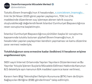 ANKARA, (DHA)- İLETİŞİM Başkanlığı Dezenformasyonla Mücadele Merkezi (DMM), "X platformu, 24 Nisan 2025 tarihli yargı kararının ardından, Ekrem İmamoğlu'nun X hesabına erişim engeli getirmiştir" açıklamasını yaptı.DMM'nin sosyal medya hesabından yapılan açıklamada, "Tutuklu Ekrem İmamoğlu'nun X hesabından, 'https://x.com/ekrem_imamoglu?s=21' linki ile 24 Nisan 2025 günü yapılan paylaşımın, TCK'nın 214'üncü maddesinde düzenlenen 'Suç işlemeye alenen tahrik' suçunu oluşturabileceği değerlendirilerek İstanbul Cumhuriyet Başsavcılığı'nca resen soruşturma başlatılmıştır. İstanbul Cumhuriyet Başsavcılığı'nca yürütülen başka bir soruşturma kapsamında tutuklu bulunan şüpheli Ekrem İmamoğlu'nun, X hesabından yapılan paylaşımları kendisi yapmaması ve kamu düzenine zarar vermesi nedeniyle; tutukluluğunun sona ermesine kadar (tedbiren) X hesabının erişime engellenmesi için; 5651 sayılı İnternet Ortamında Yapılan Yayınların Düzenlenmesi ve Bu Yayınlar Yoluyla İşlenen Suçlarla Mücadele Edilmesi Hakkında Kanunun 8/2 delaletiyle aynı kanunun 8/A maddesi uyarınca karar verilmesi, kararın hem Bilgi Teknolojileri İletişim Kurumu'na (BTK) hem de Erişim Sağlayıcıları Birliği'ne (ESB) gönderilmesi talep edilmiştir" denildi.Söz konusu talebin İstanbul 8'inci Sulh Ceza Hakimliği'nce incelendiği belirtilerek, "Yapılan incelemede hesabın tamamına yönelik erişimin engellenmesi kararı verilmeden teknik olarak söz konusu ihlale ilişkin içeriğe erişimin engellenmesi mümkün olamayacağı gözetilerek, 5651 Sayılı Kanunun 8/A maddesinin 1 ve 3'üncü fıkraları uyarınca şüpheli Ekrem İmamoğlu'na ait X hesabının erişimin engellenmesine karar vermek gerekmiştir. İstanbul Cumhuriyet Başsavcılığı'nın 24 Nisan 2025 tarihli talebi ve 5651 Sayılı Kanunun 8/A maddesinin 3'üncü fıkrası uyarınca İmamoğlu'nun X hesabına erişimin engellenmesine, kararın bir örneğinin 5651 Yasanın 8/A maddesinin 1'inci fırkası uyarınca gereği yapılmak üzere BTK ve ESB'ye gönderilmesine, kararın, 5651 Sayılı Yasanın 8/A maddesinin 1'inci fıkrası uyarınca derhal, en geç 4 saat içinde yerine getirilmesine, 2 hafta içerisinde itiraz yolunun açık olacağına 24 Nisan 2025 tarihinde karar verilmiştir. X platformu, 24 Nisan 2025 tarihli yargı kararının ardından, Ekrem İmamoğlu'nun X hesabına erişim engeli getirmiştir" ifadelerine yer verildi. (DHA)