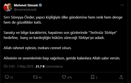 'RENKLİ KİŞİLİĞİ İLE HEM RENK HEM DENGE KATTI'Hazine ve Maliye Bakanı Mehmet Şimşek, Sırrı Süreyya Önder'in hayatını kaybetmesine ilişkin sosyal medya hesabından başsağlığı dileğinde bulunarak, "Sırrı Süreyya Önder, yapıcı kişiliğiyle ülke gündemine hem renk hem denge hem de güzellikler kattı. Sanatçı ve bilge karakterini, hayatının son günlerinde 'Terörsüz Türkiye' hedefine, barış ve kardeşliğin hüküm süreceği Türkiye'ye adadı. Allah rahmet eylesin, mekanı cennet olsun. Ailesinin ve sevenlerinin başı sağolsun, geride kalanlara Allah sabır versin" mesajını paylaştı.'SANA SÖZ, BU ÜLKEYE BARIŞ GELECEK'DEM Parti Eş Genel Başkanı Tuncer Bakırhan da sosyal medya hesabından paylaşım yaptı. Bakırhan, "Sevgili Sırrı Süreyya Önder'i kaybettik. Bu ülke, hakikati büyük bedellere rağmen dile getirmekten bir an bile imtina etmeyen büyük bir değerini yitirdi. Barışın dili, halkların kardeşliği için çarpan cesur bir yürek sustu. Sırrı, sadece bir siyasetçi değil; Türkiye'nin hafızası, onuru ve neşesiydi. Sözleriyle direnen, gülüşüyle umut olan bir insandı. Onu kaybetmenin acısı büyük. Ama biliyoruz ki Sırrı'nın düşleri bizimdir, yolu yolumuzdur. Hakkını helal et Sırrı. Uğurlar olsun, yoldaşım. Sana söz, bu ülkeye barış gelecek" dedi. (DHA)