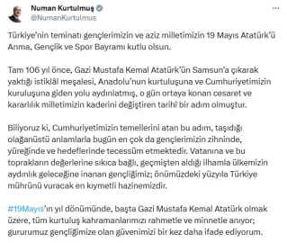 ANKARA, (DHA)- TBMM Başkanı Numan Kurtulmuş, 19 Mayıs Atatürk'ü Anma, Gençlik ve Spor Bayramı vesilesi ile tebrik mesajı paylaştı. TBMM Başkanı Kurtulmuş, sosyal medya hesabından paylaştığı mesajda, "Türkiye'nin teminatı gençlerimizin ve aziz milletimizin 19 Mayıs Atatürk'ü Anma, Gençlik ve Spor Bayramı kutlu olsun. Tam 106 yıl önce, Gazi Mustafa Kemal Atatürk'ün Samsun'a çıkarak yaktığı istiklal meşalesi, Anadolu'nun kurtuluşuna ve Cumhuriyetimizin kuruluşuna giden yolu aydınlatmış, o gün ortaya konan cesaret ve kararlılık milletimizin kaderini değiştiren tarihi bir adım olmuştur. Biliyoruz ki Cumhuriyetimizin temellerini atan bu adım, taşıdığı olağanüstü anlamlarla bugün en çok da gençlerimizin zihninde, yüreğinde ve hedeflerinde tecessüm etmektedir. Vatanına ve bu toprakların değerlerine sıkıca bağlı, geçmişten aldığı ilhamla ülkemizin aydınlık geleceğine inanan gençliğimiz; önümüzdeki yüzyıla Türkiye mührünü vuracak en kıymetli hazinemizdir. 19 Mayıs'ın yıl dönümünde, başta Gazi Mustafa Kemal Atatürk olmak üzere, tüm kurtuluş kahramanlarımızı rahmetle ve minnetle anıyor; gururumuz gençliğimize olan güvenimizi bir kez daha ifade ediyorum" dedi. (DHA)