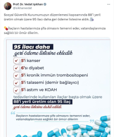 ANKARA, (DHA)- ÇALIŞMA ve Sosyal Güvenlik Bakanı Vedat Işıkhan, Sosyal Güvenlik Kurumu'nun düzenlemesi kapsamında 88'i yerli üretim olmak üzere 95 ilacı daha geri ödeme listesine aldıklarını duyurdu.Bakan Işıkhan, sosyal medya hesabından yaptığı açıklamada, "95 ilacı daha geri ödeme listesine ekledik. 5'i kanser, 6'sı diyabet, 5'i kronik immün trombositopeni, 5'i talasemi (demir bağlayıcı), 5'i astım ve KOAH tedavilerinde kullanılan ilaçlar başta olmak üzere 88'i yerli üretim olan 95 ilaç geri ödeme listesine dahil edildi. İlaçların hastalarımıza şifa olmasını temenni eder, vatandaşlarımıza sağlıklı bir ömür dilerim" dedi. (DHA)